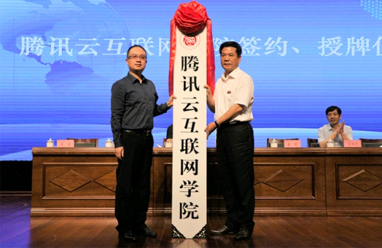 绍兴文理学院元培学院-腾讯云互联网学院揭牌仪式,学院副院长、党委副书记叶访春(右),腾讯云教育行业总经理龚振(左)
