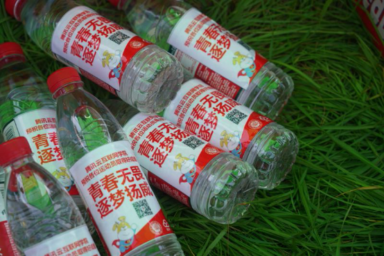 首先是矿泉水分发工作。为了给运动员提供充足的水分。矿泉水上都有着我们腾讯云的logo和二维码,以及“青春无畏,逐梦扬威”的标语,表达了期望运动员能够在我们的后勤下无虑比赛,勇夺桂冠的期望和祝福,也让大家在参与比赛的同时能够关注我们的微信公众号。